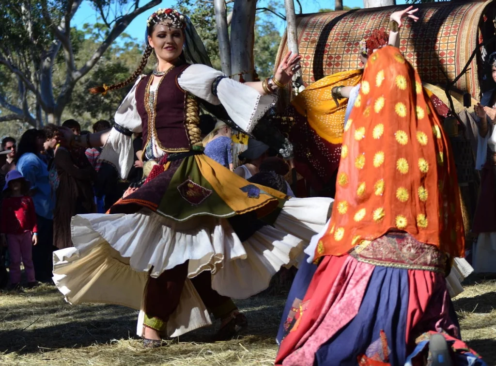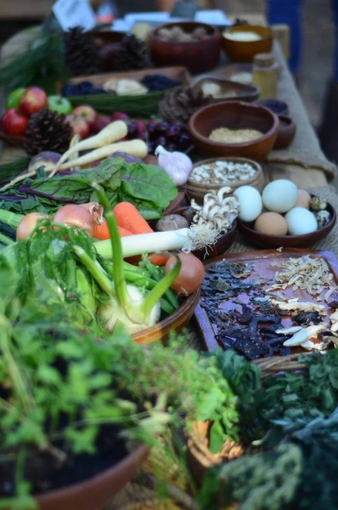 Abbey in 2014 felt more mature than the early years — the demonstrations were more refined, the market more substantial, the performance spaces better organised. The food display in the medieval kitchen tent was extraordinary: a long trestle table covered in period-accurate vegetables, eggs, dried herbs, and clay vessels, arranged as if someone was about to cook a feast. I spent twenty minutes photographing it.