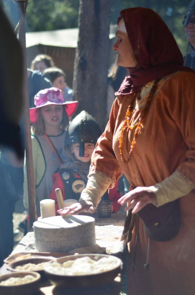 On the kitchen demonstration: A woman in rough-spun linen was grinding grain on a stone quern while a small crowd of children watched. The children were clearly fascinated. She was clearly used to the children. That gap in attention — the demonstrator absorbed in the task, the audience wide-eyed — is one of my favourite dynamics to photograph.