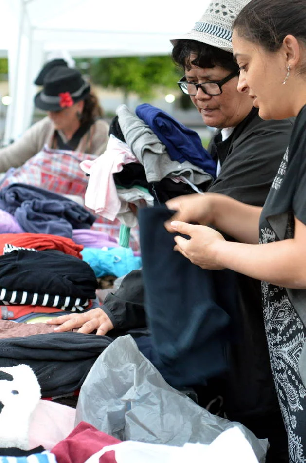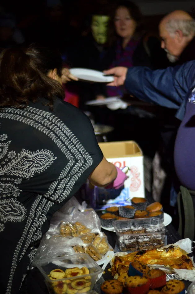 On the clothing table: The clothing distribution was the most quietly moving part of the night. Donated winter gear — jackets, jumpers, warm socks — laid out on tables, and volunteers helping people find things in their size. No paperwork, no conditions, no questions.