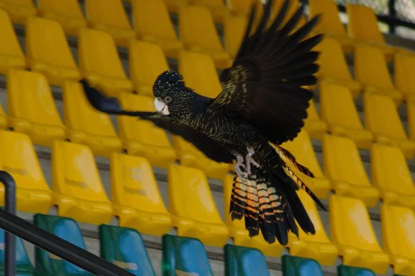 On the cockatoo flight show: The bird show takes place in a stadium with yellow and green seats. When the red-tailed black cockatoo came in low during the demonstration, the colour contrast between its plumage and the seating was extraordinary. I had one pass to get it. I got it.