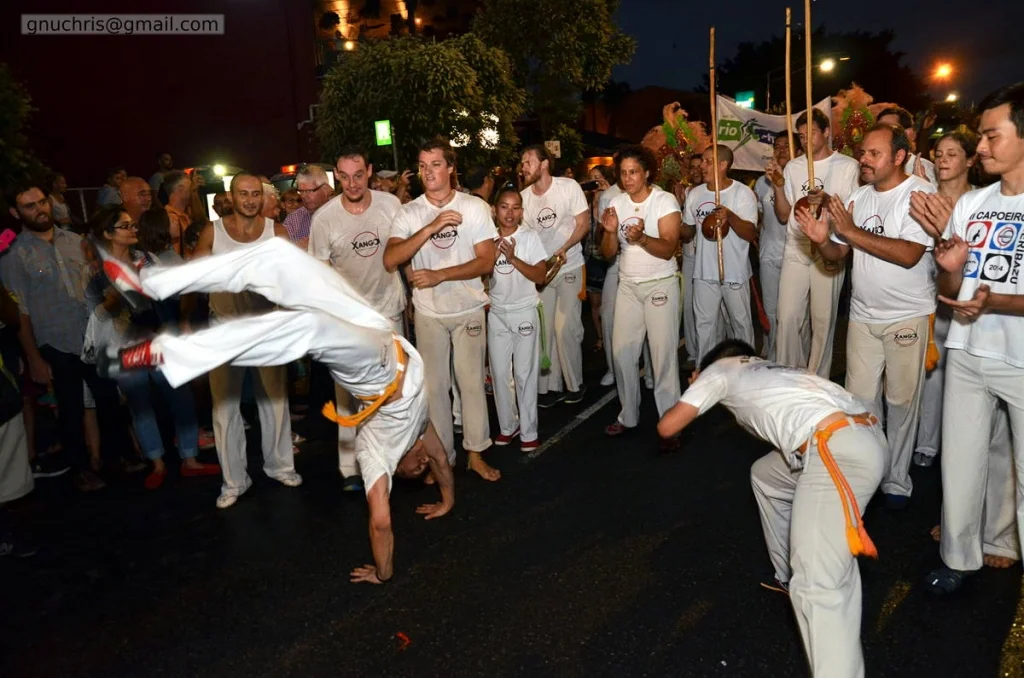 On the capoeira: The capoeira demonstration stopped the crowd on a side street. A ring formed around two practitioners working through a ginga, and the inversions and kicks that followed happened at a speed that required pre-visualisation rather than reaction. I watched two full sequences before I started shooting. By the third I had the timing.