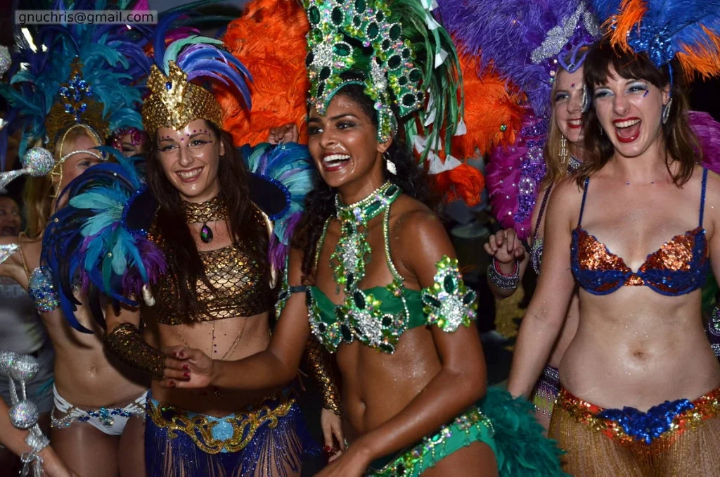 On the samba: The samba schools are the visual centrepiece of the event. The costumes — hand-sewn, beaded, feathered — represent months of preparation, and you can see it. Close-up portraits of the dancers reward a longer lens; wide shots showing the full parade require getting off the footpath entirely. I spent most of the parade moving between the two registers.