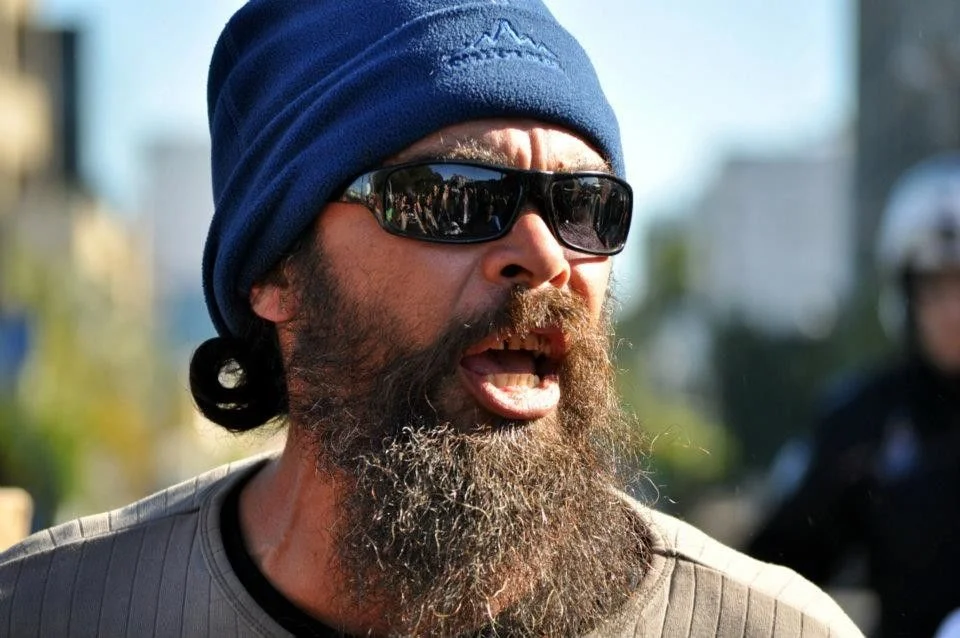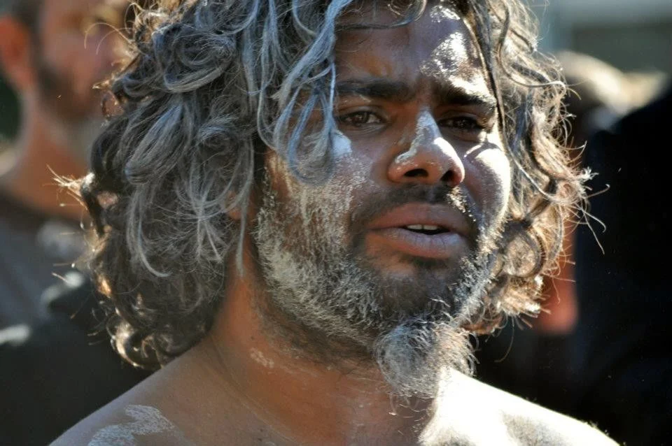 On the ceremonial paint: Several participants wore white ochre — on faces, on chests, on arms. The paint reads differently in photographs depending on the light. In full sun it bleaches out; in the partial shade of the park it holds detail and gives the portraits a quality that studio work cannot replicate.