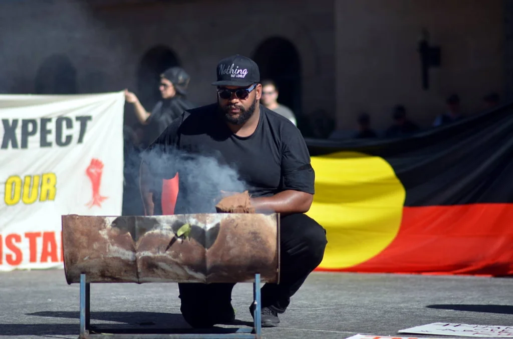 On the smoking ceremony: Near the end of the rally, an Aboriginal man in a black cap crouched over a half-barrel of smoking eucalyptus while the Aboriginal flag was held behind him. The smoke rose in a thin column in the winter light. It was the most composed image of the day — the one that felt like a statement rather than a record.