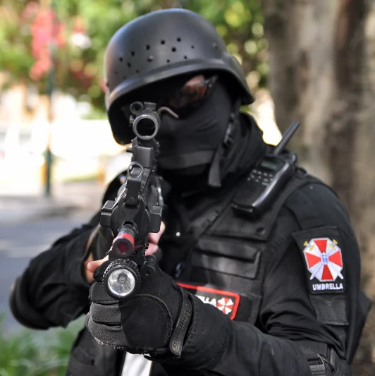 On the Umbrella Corporation: One participant had assembled a full Resident Evil Umbrella Corporation tactical kit — body armour, helmet, rifle, radio, the patch — and walked the entire route in character. He aimed the rifle directly at my lens when I photographed him, which was the right call.