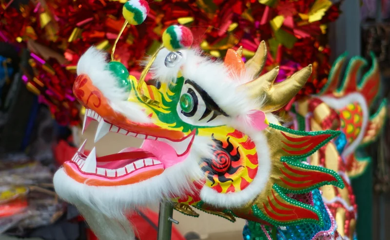 On the dragon: The dragon costume arrives flat and inert in a crate and becomes something entirely different once the operators are inside it. Shooting the head close and tight before the performance begins gives you an image that reads as a portrait — it has eyes, expression, personality. That intimacy disappears once it starts moving.