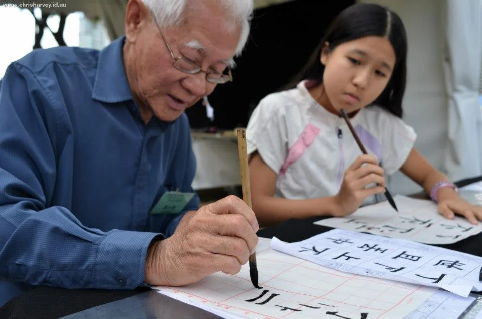 On the quieter things: The calligraphy demonstration at the outdoor stalls produced one of the most straightforward images of the day: an elderly man and a young girl, side by side, both holding brushes. The concentration on both faces was identical.