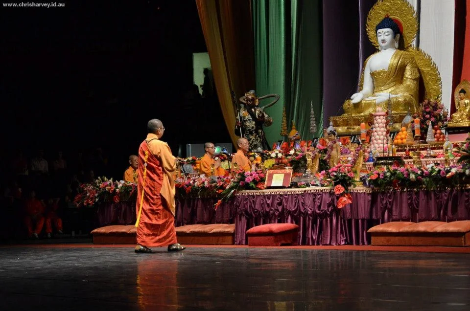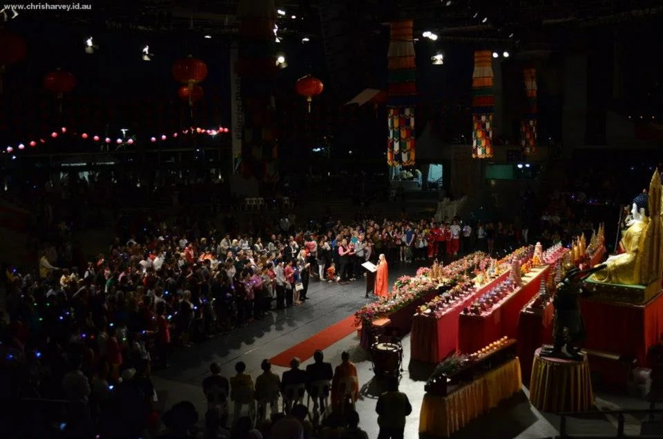 On the main ceremony: The indoor ceremony has grown each year. By 2013 it was filling a large arena — the shot from the upper level shows thousands of attendees holding small blue lights while lanterns hang from the rafters and the altar glows at the far end. That wide image is about scale. The event is genuinely large.