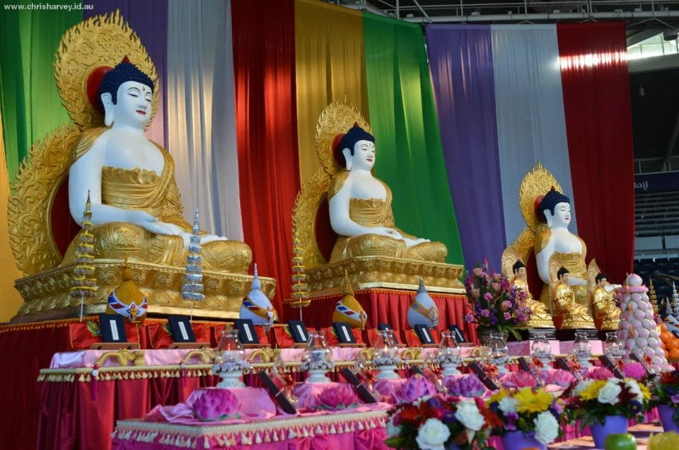 On the altar: The three Buddha statues against the coloured silk drapes were already photogenic before anyone arrived. I spent time before the ceremony began working out the best angle — the slight diagonal that creates depth without losing the symmetry.