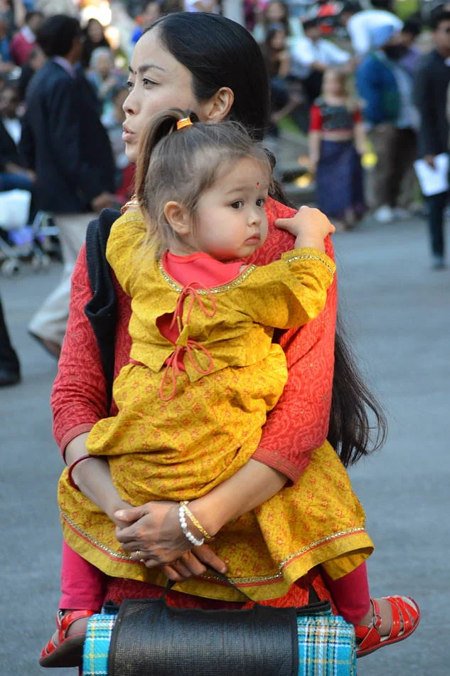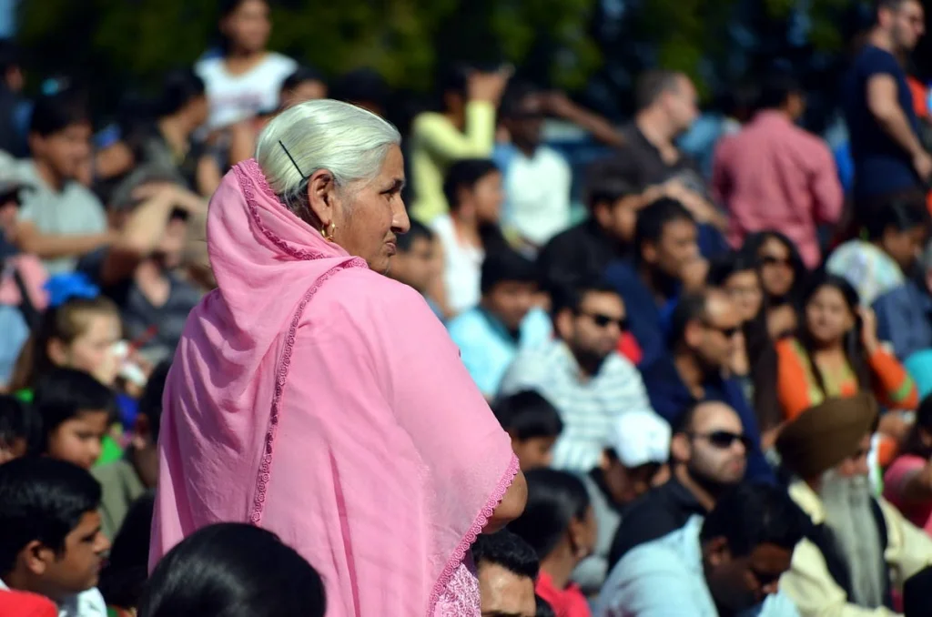 On the crowd: A culturally specific event like this changes the crowd photographs completely. The India Day Fair draws people who have dressed for the occasion — not in the performative sense of a costume parade, but in the ordinary sense of wearing what you wear when your community gathers. The woman in the pink shawl, the father holding his daughter and an Indian flag, the elderly woman watching the stage — these are images about belonging.