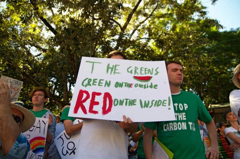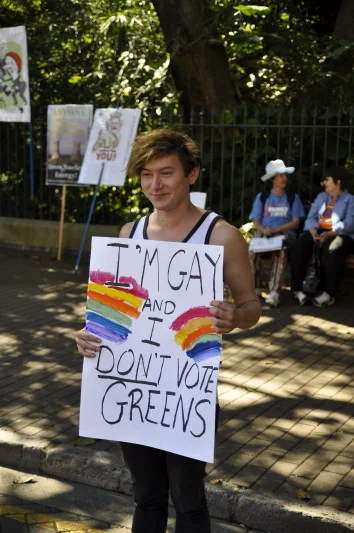 On the outlier: The young man with the “I’m Gay and I Don’t Vote Greens” sign came on his own and stood near the edge of the rally. I do not know his argument beyond the sign. The photograph doesn’t take a position on it. It records that he was there and that he had made a sign and that he held it up.