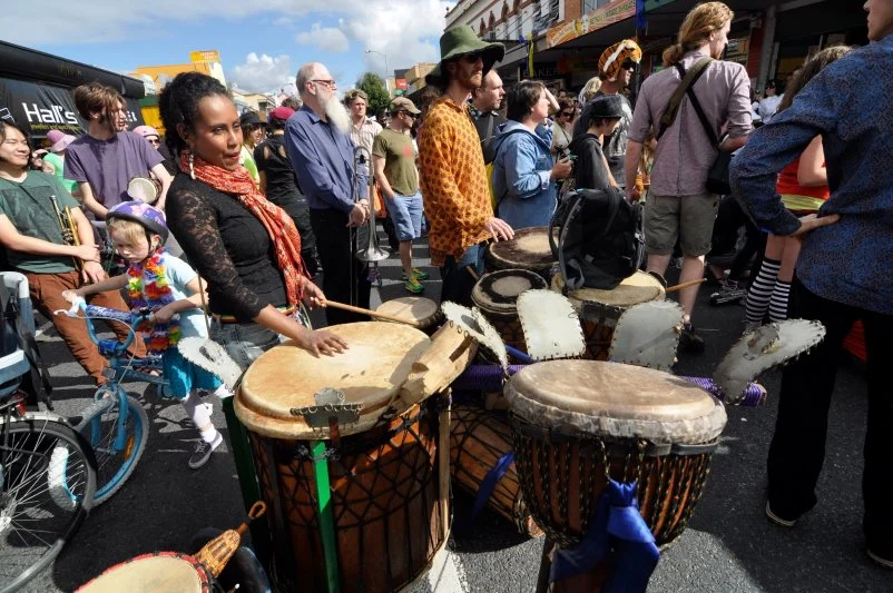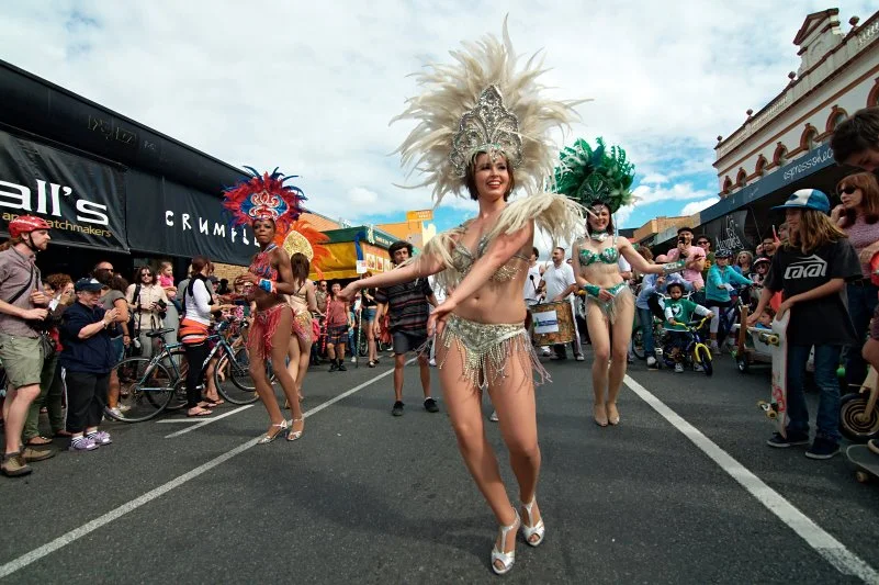 I have photographed it several times. What I keep returning to is the way the event layers different visual registers on top of each other: the athletic intensity of the roller derby, the spectacle of the samba dancers, the casual costuming of the crowd, the architecture of the heritage shopfronts. All of it in one street, in one afternoon.