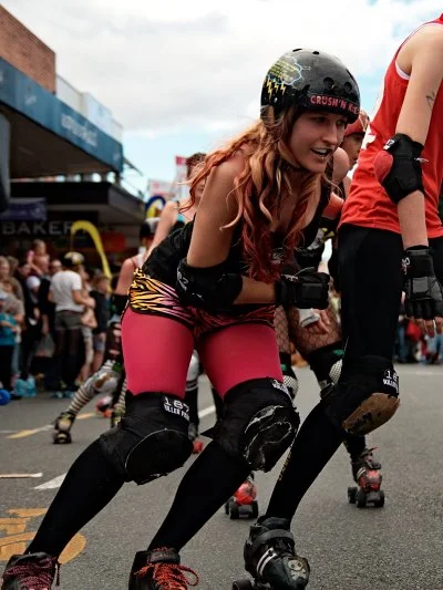 On the derby itself: Roller derby photography is technically demanding. The skaters are fast, the action changes direction quickly, and the street setting means your background is constantly in motion too. I use a fast shutter speed and accept that some images will be soft, focusing instead on catching the moments of contact and competition — the lean into a corner, the jostling between skaters — rather than trying to freeze every run.