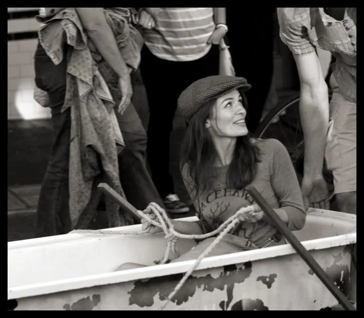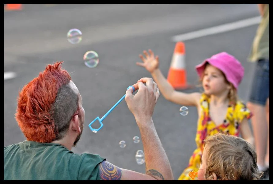 On the bathtub races: The bathtub race is exactly what it sounds like — a bathtub on wheels sent down the hill on Boundary Street, usually with one person inside and several others pushing. The photography is difficult because the action is fast and unpredictable, but the slower moments — the preparation, the waiting, the in-between — are often better than the race itself. The woman in the bathtub, holding the rope, looking up, produced one of the more composed images of the day.