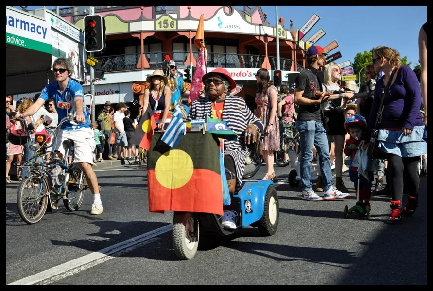 On the elder with the flag: One of the most significant images I made at the 2012 derby was of an Aboriginal elder on a mobility scooter, moving through the intersection with an Aboriginal flag attached to the front. West End has a long history of being home to Brisbane’s Aboriginal community, and her presence at the community festival carried a weight that I wanted to record without overstating.