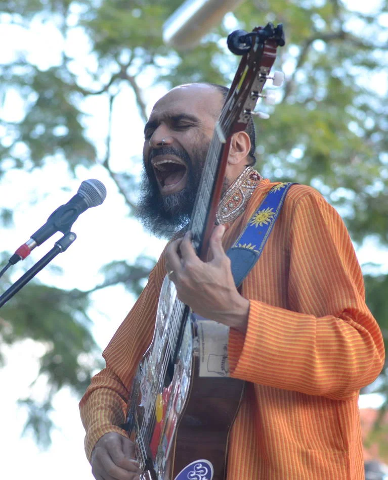 On the musicians: The music stage at the Moorooka Festival ran all day and into the evening, and the programme was as diverse as the crowd — reggae, South Asian classical, folk, pop. The guitarist in the orange kurta was mid-song when I photographed him, and the image has the quality of someone who is not thinking about being photographed. The evening set, shot in the warm stage light after the sun went down, produced a different kind of image from the afternoon work.