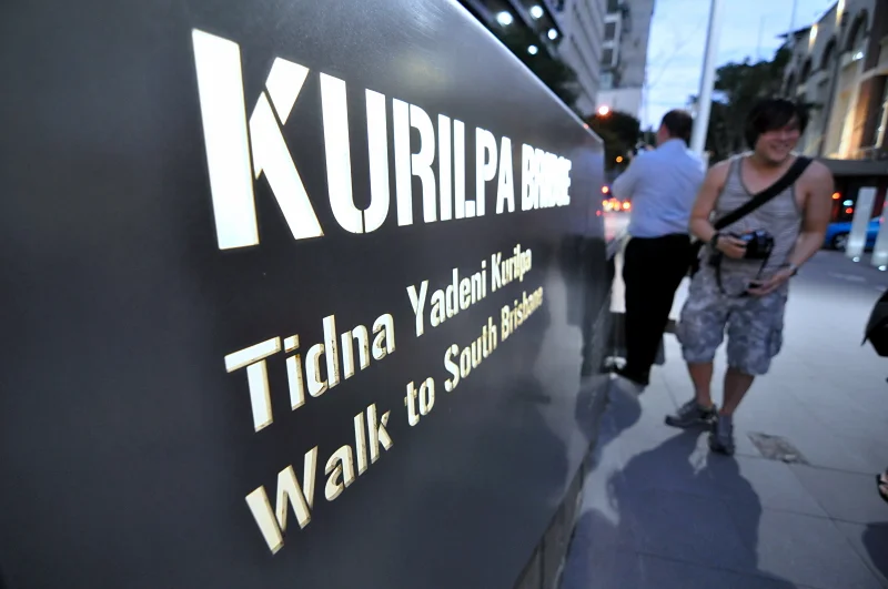 On Kurilpa specifically: The sign at the entrance — “Kurilpa Bridge / Tidna Yadeni Kurilpa / Walk to South Brisbane” — is one of the best text photographs in Brisbane. The bilingual naming, the gold on black, the way a photographer in the background just happens to be smiling. I got that image almost by accident, walking past it, and it ended up being one of the better frames of the night.