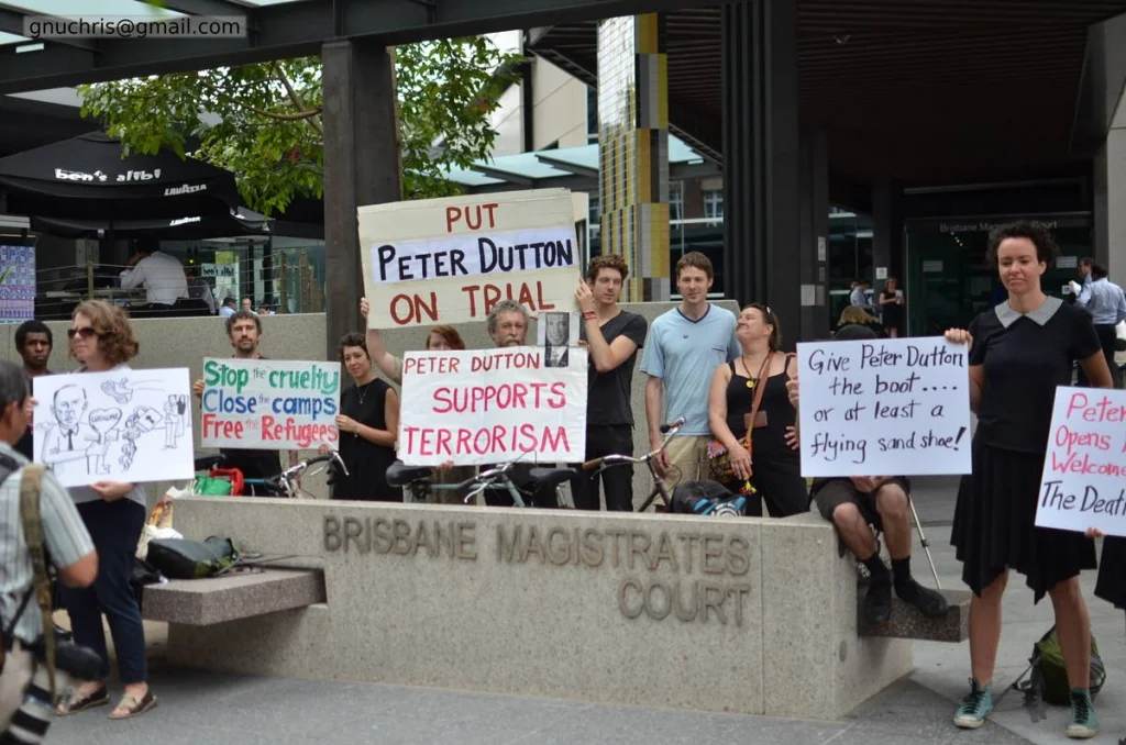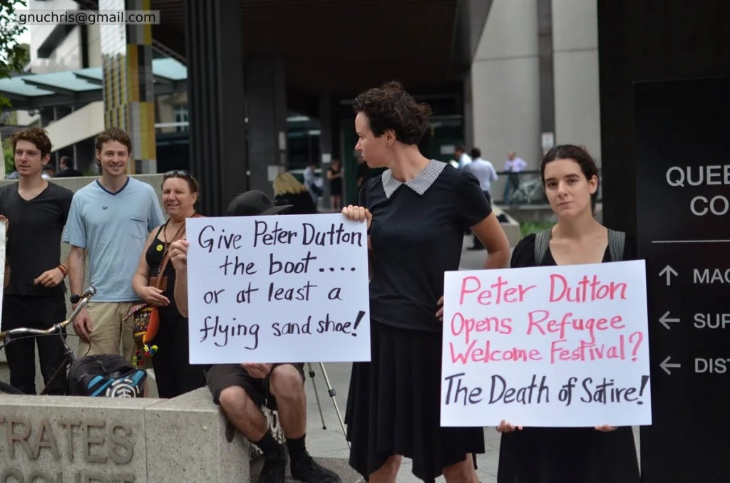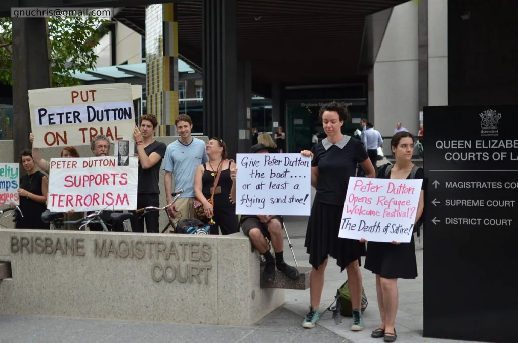 In November 2015, a protester was fined $1000 for demonstrating outside Peter Dutton’s electorate office. In response, a small group gathered outside Brisbane Magistrates Court — not a large rally, not a march, but the kind of focused demonstration that punches above its numbers because everyone there has thought carefully about why they are standing on that particular footpath.